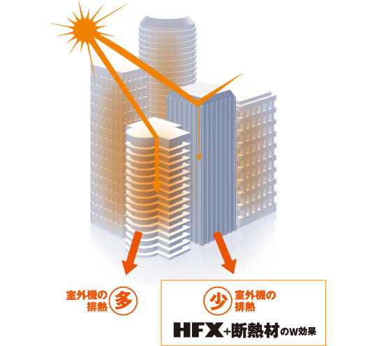 都市部の緑地面積減少や、ビルから排出される冷房室外機の排熱の増加、アスファルトなどの都市構造を原因とするヒー トアイランド。各行政でもさまざまなガイドラインや施策が進められています。住ベシート防水では、『HFXシート』の太陽熱 反射による温度上昇の抑制効果を、さらに強化できる断熱材を組み合わせた工法により、ヒートアイランド現象の抑制に 貢献します。